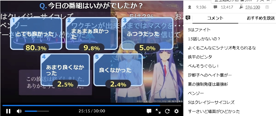1~2話のアンケートは「とても」が87.8%「まあまあ」が7.4%、計95.2%が「良かった」だった。